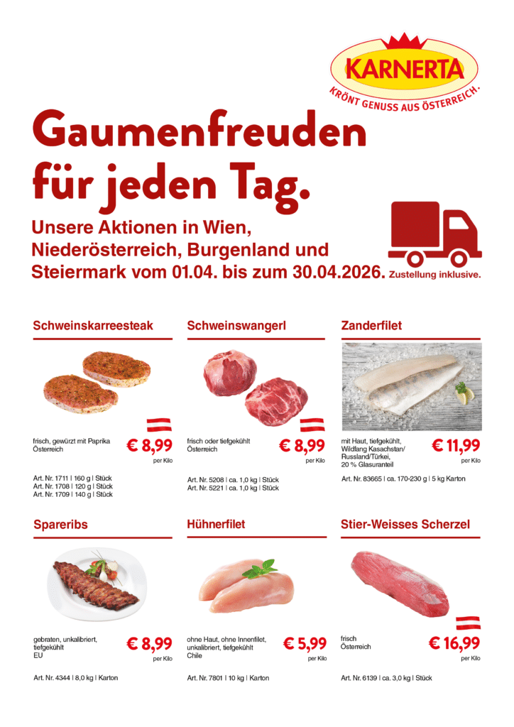 Lassen Sie sich jeden Monat von unseren exklusiven Angeboten inspirieren – mit köstlichen Gaumenfreuden, die Ihre Küche bereichern. Unsere hochwertigen Fleisch- und Wurstwaren, die Teigwaren und die Fischspezialitäten überzeugen nicht nur durch ihren ausgezeichneten Geschmack, sondern auch durch ihr attraktives Preis-Leistungs-Verhältnis. Planungssicherheit mit vierzig Aktionsartikeln pro Monat ist damit garantiert.