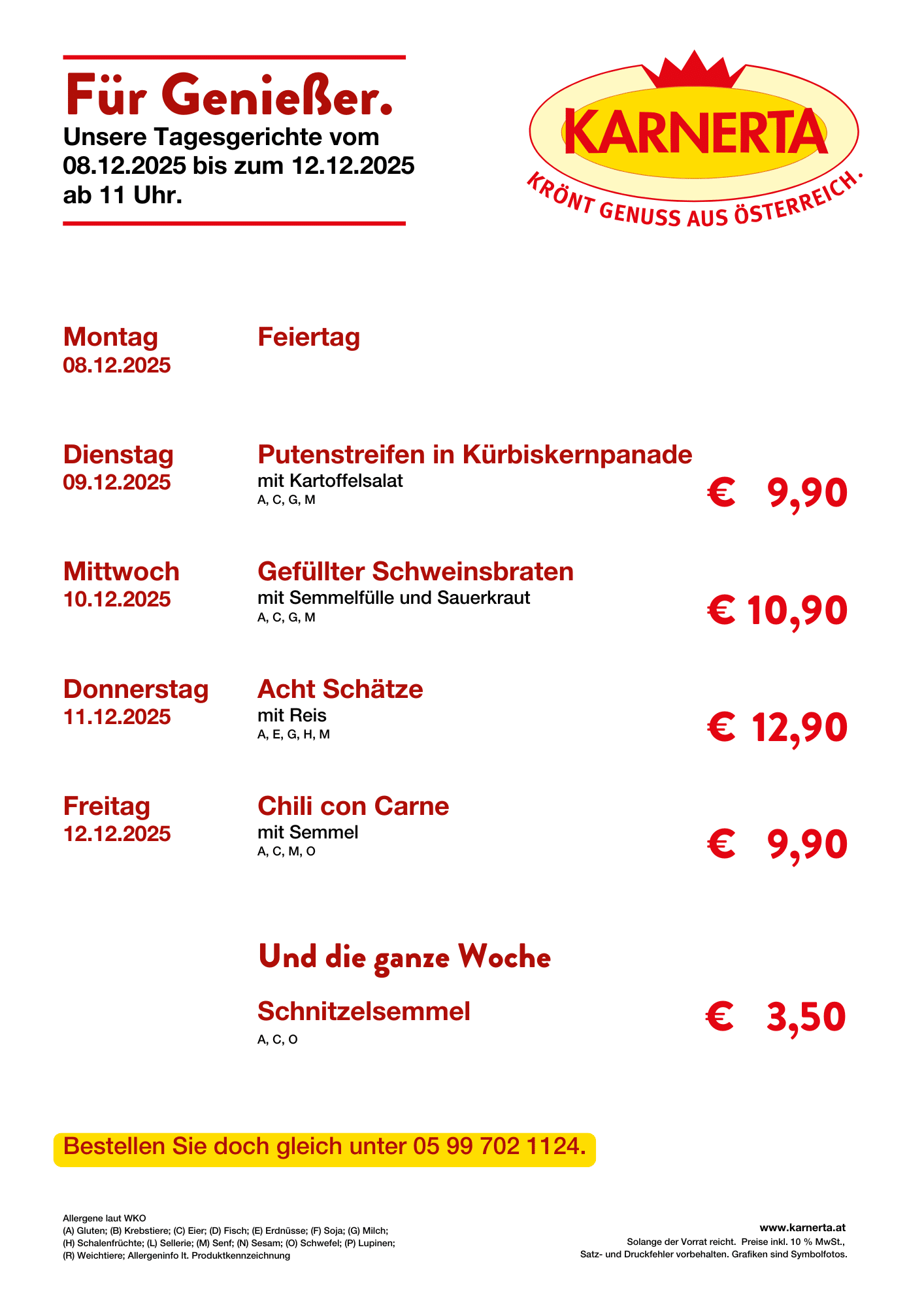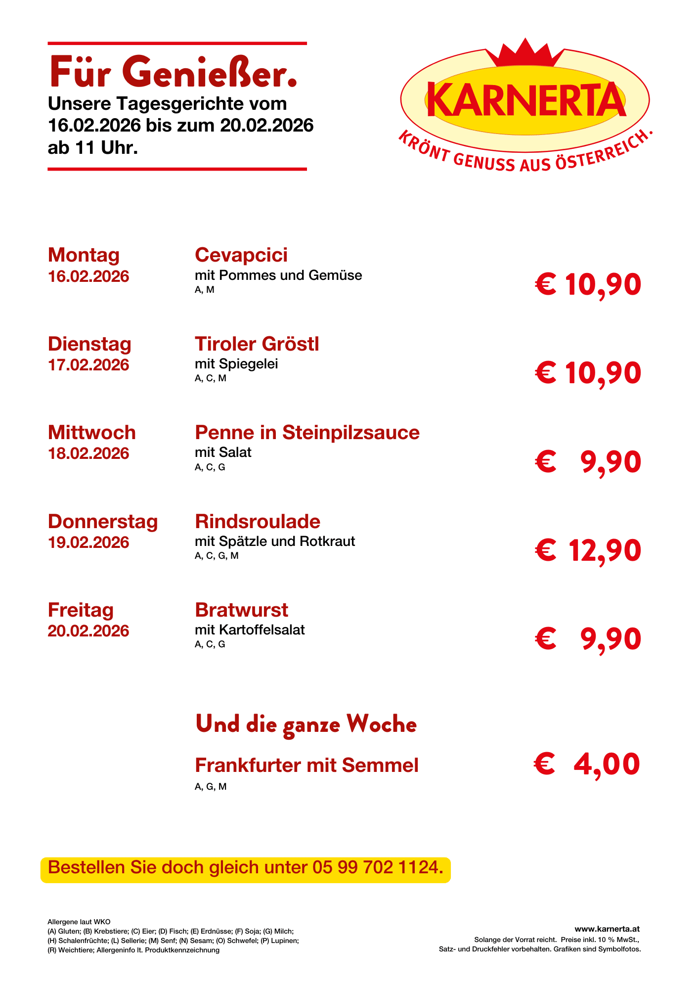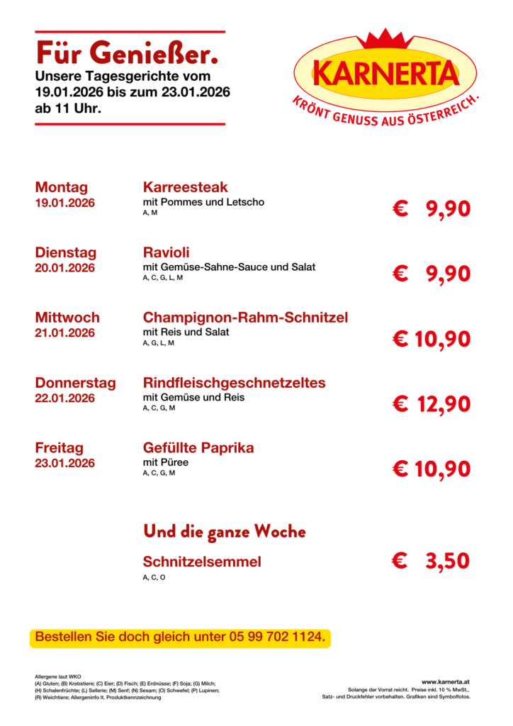 Was essen Sie heute zu Mittag? Unser herzhaftes Tagesgericht oder die Wochenspezialität? In unserem KARNERTA Fachmarkt am Südring in Klagenfurt erwarten Sie abwechslungsreiche Gerichte für eine schnelle, feine Pause. Und die genießen Sie vor Ort – in unseren bequemen Sitzecken – oder zum Mitnehmen ins Büro oder nach Hause. Guten Appetit.